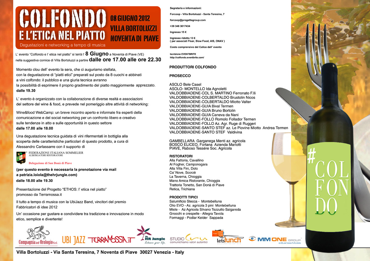 Venerdì 8 giugno alle ore 17.00 si terrà a Noventa di Piave (VE) nella suggestiva cornice di Villa Bortoluzzi Col Fondo e l’etica nel piatto: un evento nel quale sarà possibile degustare i Col Fondo di 12 aziende del territorio della D.o.c.g.. Momento clou della serata sara la degustazione di piatti etici preparati sul posto da 8 cuochi ed abbinati ai vini col fondo: il pubblico ed una giuria tecnica avranno la possibilità di esprimere il proprio gradimento del piatto maggiormente apprezzato dalle 19.30. Ci sarr inoltre una degustazione tecnica guidata dei vini a rifermentazione in bottiglia alla scoperta delle caratteristiche particolari di questo prodotto a cura di Alessandro Carlassarre con il supporto di F.I.S.A.R.. Il tutto a tempo di musica con il supporto della Ubi Jazz Band, recenti vincitori del premio Fabbricatori di idee 2012.